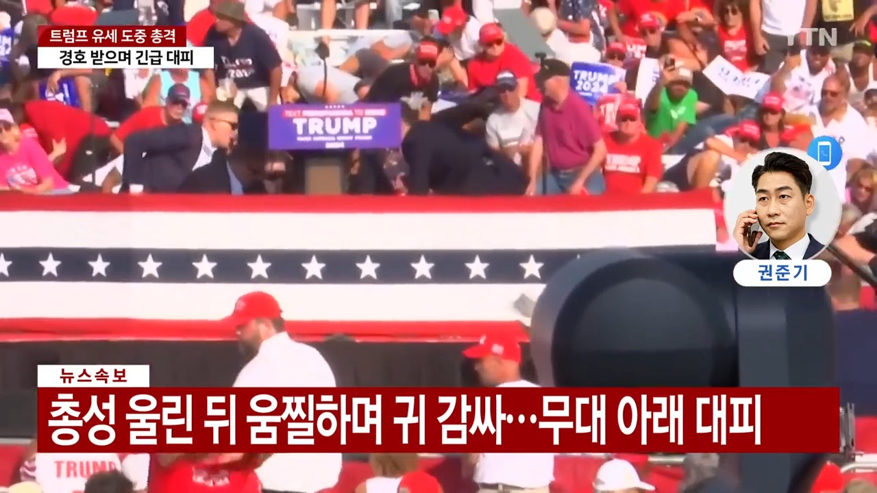 총성이 울린 직후 트럼프가 연설하던 연단은 비명소리가 난무하는 아비규환의 사태가 벌어졌다. 트럼프는 연탁뒤에 몸을 숨긴 상태다.