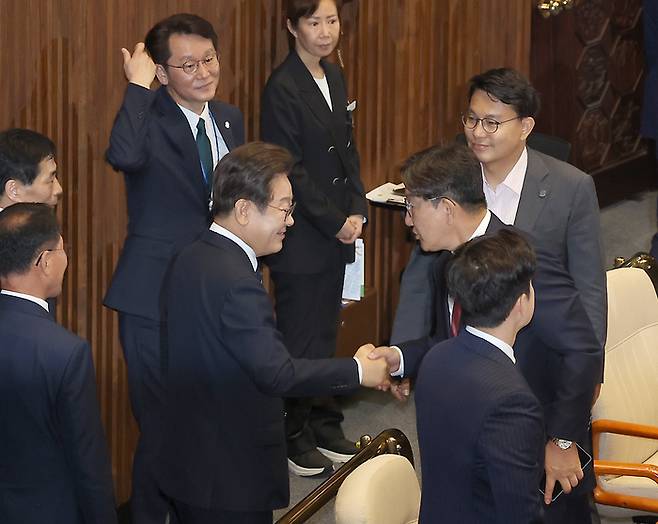 이재명 대통령이 26일 국회 시정연설을 마친 뒤 국민의힘 권성동 의원과 인사하고 있다. [사진 = 연합뉴스]
