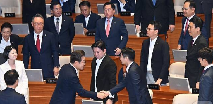 이재명 대통령이 26일 취임 후 첫 추가경정예산안 시정연설에 앞서 국회의장 접견실에서 김용태 국민의힘 비상대책위원장과 악수를 하고 있다.  (사진 = 경향신문, 대통령실 사진 기자단)
