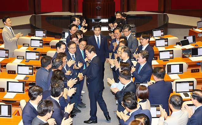 이재명 대통령이 26일 국회 시정연설을 위해 본회의장에 입장하며 더불어민주당 의원들과 악수를 나누고 있다. (사진 = 헤럴드 경제)